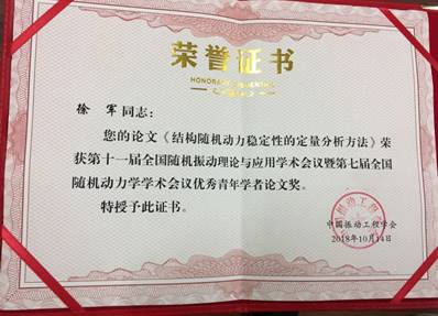 徐军副教授在大会做了题为《结构随机动力稳定性的定量分析方法》大会邀请报告,并获得优秀青年学者论文奖。