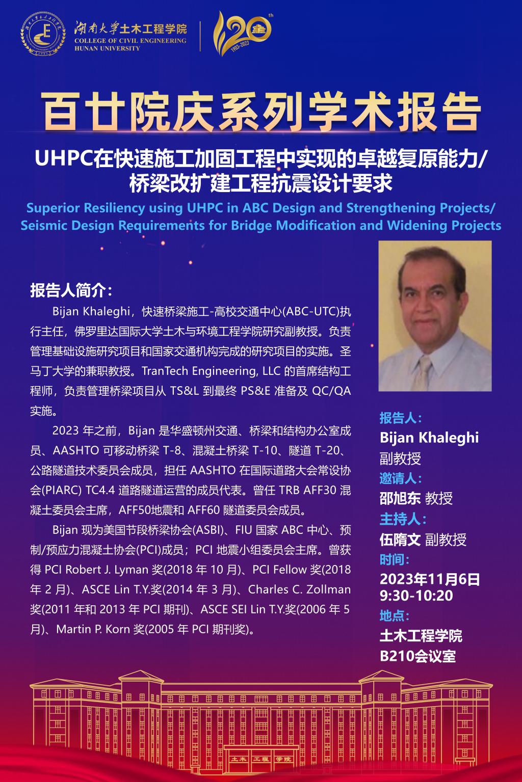 百廿院庆 学术活动|Bijan Khaleghi :UHPC在快速施工加固工程中实现的卓越复原能力/ 桥梁改扩建工程抗震设计要求