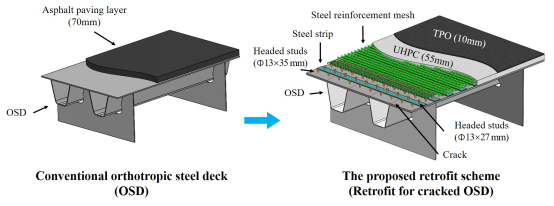 邵旭东教授团队提出采用UHPC层对钢桥面进行加固处理,以提高钢桥面刚度,显著降低疲劳应力幅,首创了新颖的带钢板条UHPC层加固方案,采用55mm厚UHPC+10mm厚TPO,自重与原沥青面层相当,解决了受损钢桥面不能可靠参与UHPC层的受力、加固方案自重严格受限等技术难题。试验结果表明,在正、负弯矩作用下,UHPC层的抗裂性能完全满足要求,加固后原钢桥面各疲劳细节的应力幅下降36~89%。