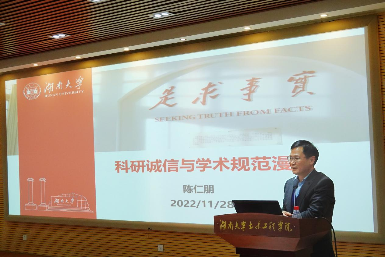 陈仁朋教授首先以自身对孩子的家庭教育为引,详细讲解科研诚信的定义,并阐述了学校关于研究生违背科研诚信处理办法。接着,以多个真实案例生动形象地解释了学术不端的具体表现形式及国家对于学术造假等行为的零容忍,进而告诉同学们该如何避免学术不端行为。最后,从团队的角度提出课题组对于发表论文的具体要求,对同学们未来科研道路提出希冀。