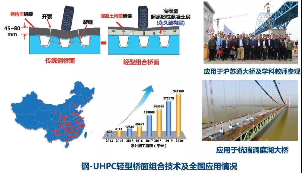 针对钢桥桥面长期存在的疲劳开裂、铺装频繁破损等难题,在团队主要成员邵旭东教授领导下,提出了钢-薄层超高韧性混凝土组合桥面新体系,提高桥面局部刚度30倍以上,大大降低了钢桥面疲劳开裂风险,显著延缓了钢桥面铺装的破损速率,大大降低了铺装翻修的巨额成本。