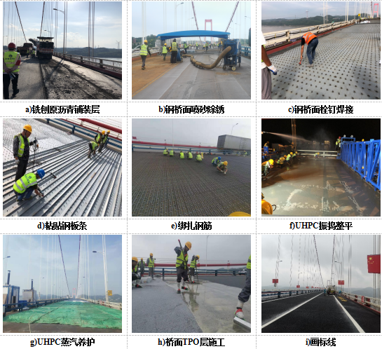 宜昌大桥维修加固工程于2021年8月5日开始,12月4日结束并全面开放交通。桥面施工工艺如下所示(图3)。其中UHPC从跨中往两端对称浇筑,首次实现了约20小时单次浇筑10250平米的高效施工新纪录。TPO施工工艺严格控制,平整度良好,保证了TPO首次用作UHPC上罩面层的成功。