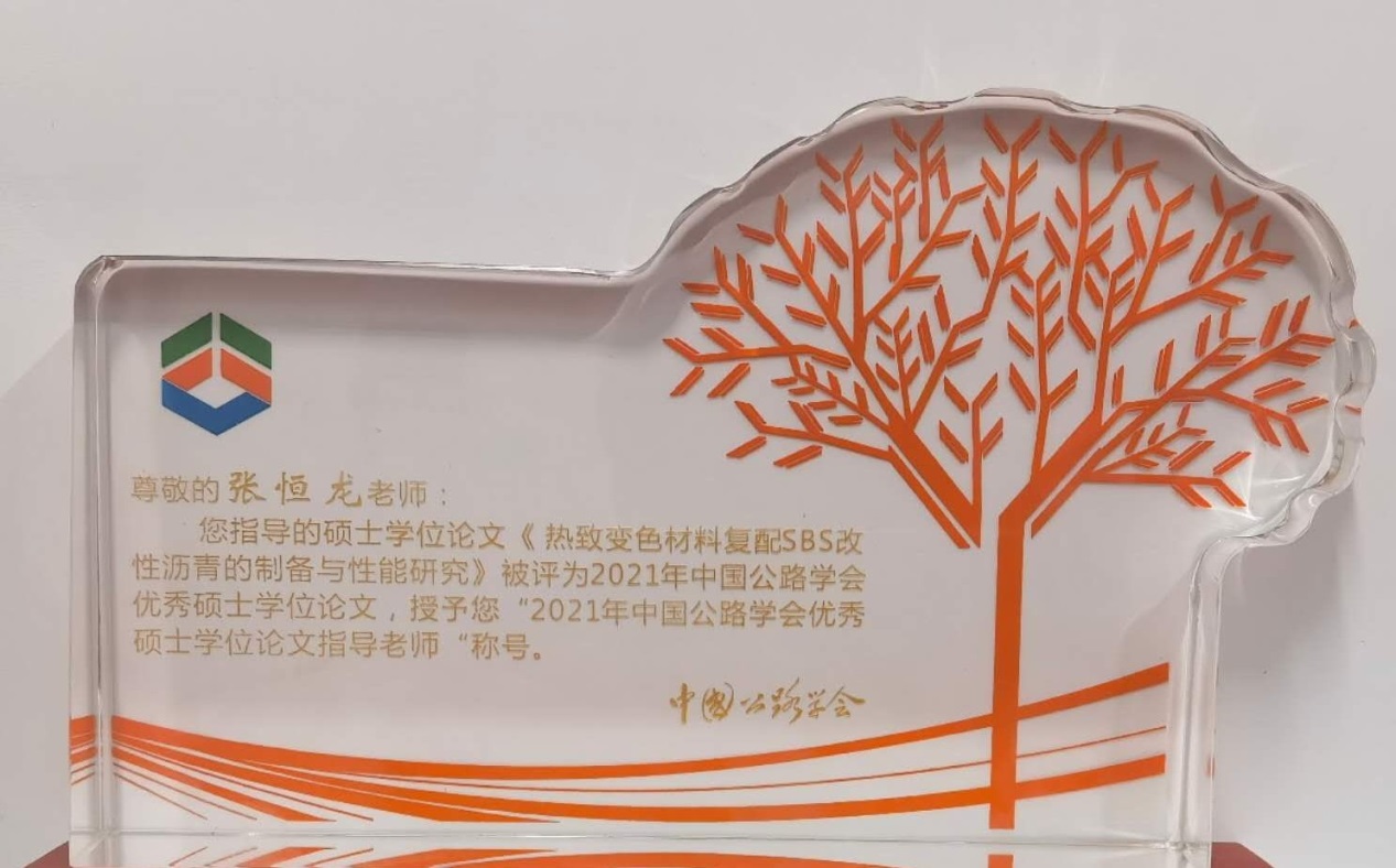 2019届毕业生李璐的学位论文《热致变色材料复配SBS改性沥青的制备与性能研究》,荣获2021年度中国公路学会优秀硕士论文奖,其导师张恒龙副教授获得“中国公路学会优秀硕士论文指导教师”称号。本次共有来自同济大学、东南大学、哈尔滨工业大学等高校的102篇硕士论文参与评选,最终20篇硕士学位论文入选,并在2021年6月15日召开的世界交通运输工程技术论坛(WTC2021)上举行了颁奖典礼。