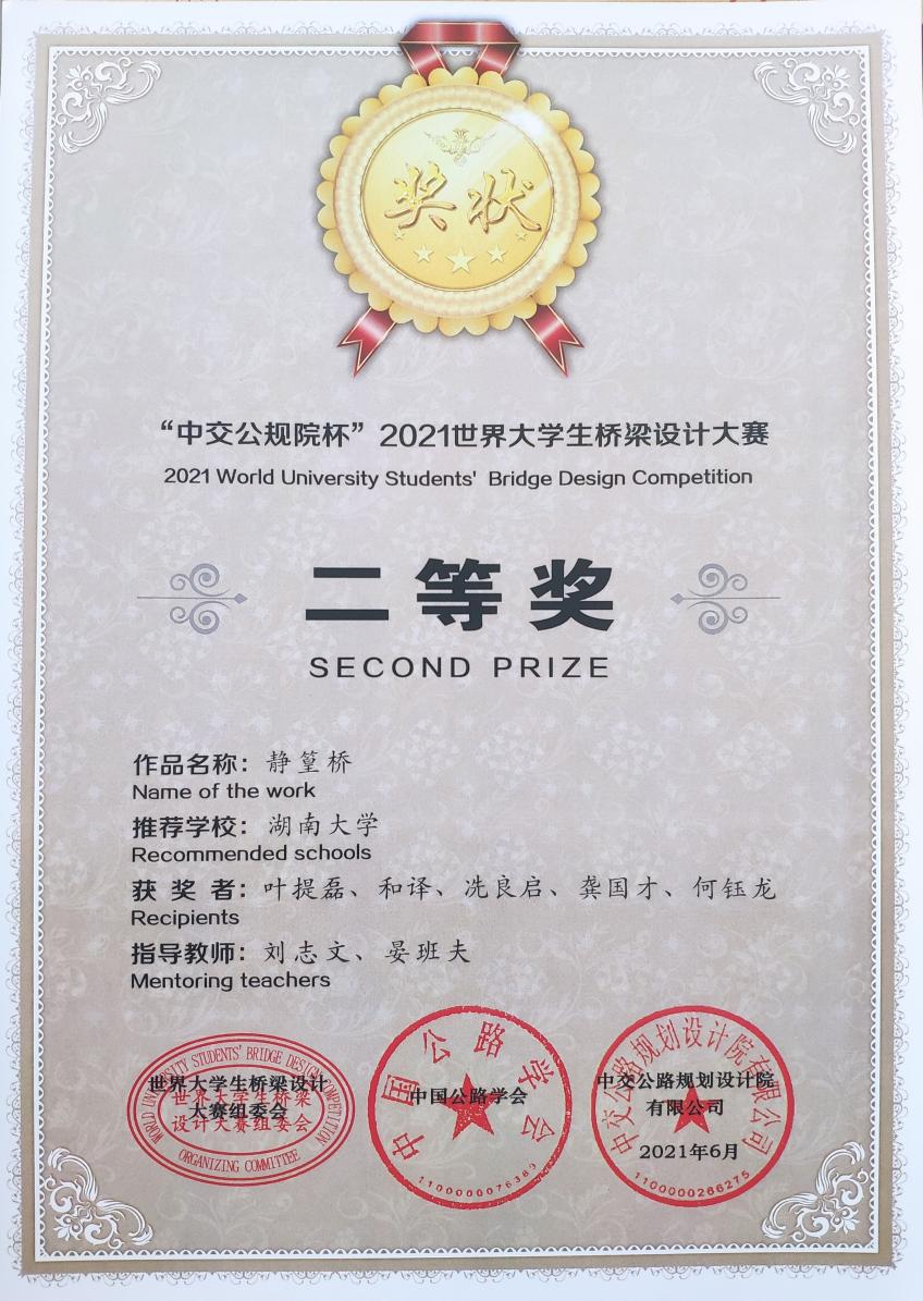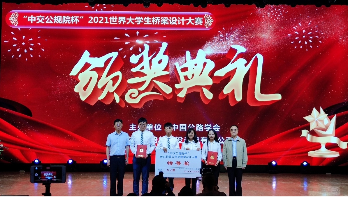 “中交公规院杯”2021世界大学生桥梁设计大赛是中国公路学会与中交公路规划设计院有限公司共同主办的国际赛事,自2017年创办至今已连续举办了四届。大赛旨在引导高等学校培养大学生的创新设计意识、综合设计能力与团队协作精神;加强学生动手能力的培养和工程实践的训练,鼓励学生针对实际需求,通过创新思维进行桥梁设计;吸引、鼓励广大学生踊跃参加课外科技实践活动,为优秀人才脱颖而出创造条件;发现并培养更多的桥梁设计专业人才,为推动世界桥梁建设进步提供更多人才储备。作为2021世界交通运输大会的重点活动之一,经过院校推荐,评审会初审,评审会终审等过程,经过专家学者的严格评审,大赛组委会从57所世界高校提交的200余件作品中遴选10项作品进入终审决赛环节。