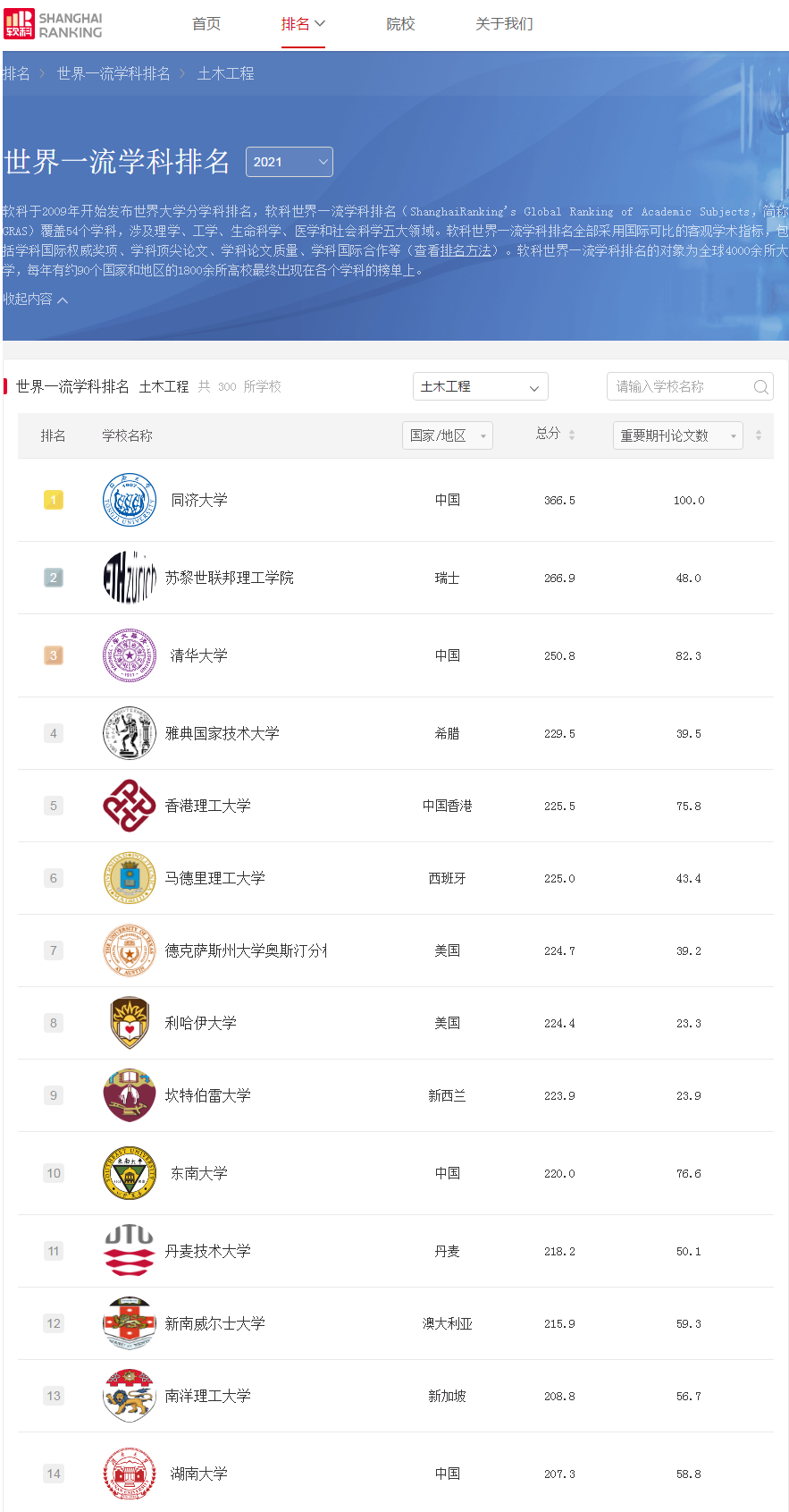 近日,上海软科正式发布软科世界一流学科排名(ShanghaiRanking's Global Ranking of Academic Subjects),无码影片 土木工程学科的排名持续上升,2021年位列世界第14位,中国内地高校第4位。