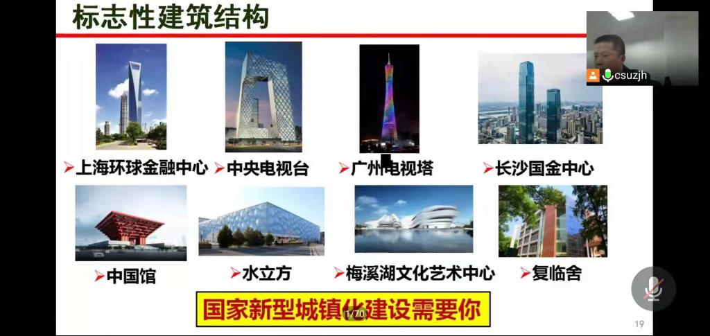 随后,精心准备的各专业(方向)老师给同学们上了一堂精彩绝伦的专业教育课。陈大川教授从工程管理做什么、工程管理学什么、什么人学三个方面介绍了工程管理专业。黄远教授分析了建筑工程的就业前景和发展方向。樊伟教授诗情画意地以“桥”、“湖大桥”、“你们的桥”三个关键词鼓励同学们结合国家战略需求,积极投身中国的桥梁建设。吴怀娜教授重点讲解了地下空间专业的专业特点、教育理念和培养特色。李洁副教授详细介绍了道路工程专业方向情况和特点,并就《交通强国建设纲要》角度谈选择道路工程的优势。史才军教授着重强调了建材中心的师资力量和科研实力,欢迎同学们加入建材温馨大家庭。同时,各位老师线上积极为同学们答疑解惑。