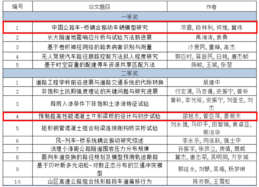 邓露教授团队发表的《中国公路车-桥耦合振动车辆模型研究》论文荣获一等奖,邵旭东教授团队发表的《预制超高性能混凝土π形梁桥的设计与初步试验》论文荣获二等奖。以上获奖成绩表明无码影片