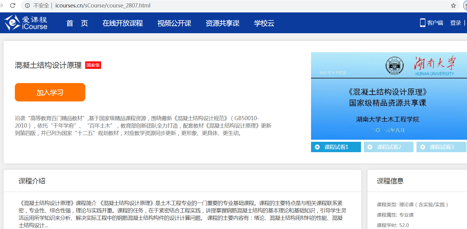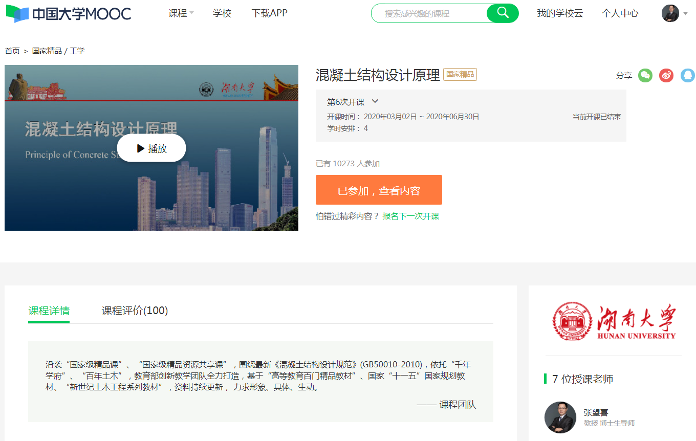2018年,以张望喜教授为负责人,沿袭“国家级精品课”、“国家级精品资源共享课”传统,围绕最新《混凝土结构设计规范》要求,精心打造了“国家精品在线开放课程”,在“中国大学MOOC”网上线。参与建设成员,包括张望喜、方志、廖莎、唐昌辉、黄靓、周云、黄远等。