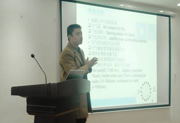 爱荷华州立大学的张超博士报告了“混凝土气孔结构在不同时期的稳定性及其变化原理”。该报告从气孔结构稳定性的角度来探讨不同时期的混凝土气孔结构的特点和变化原理,所讨论的内容包括拌和前的外加剂检测,拌和后的振捣影响,以及拌和后气孔测量时气孔的结构变化。
