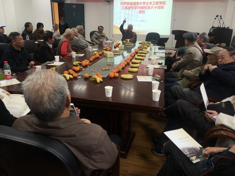 58级校友发言表示非常感谢学院的领导,安排的如此贴心,车、水果、场地。特别感谢黄道良老师、罗国强老师,又给大家上了一堂课。犹记得当年成文山老师在岳麓书院为我们上的第一堂课,成老师刚从苏联回来,现场还唱了一首苏联歌曲。后来成文山老师去广州又给我们讲了几次课,真的非常怀念他。感谢陈行之老师,但是由于他行走不便,不能前来。总之,感谢母校,感谢老师,感谢同学们,希望能有更多的聚会。