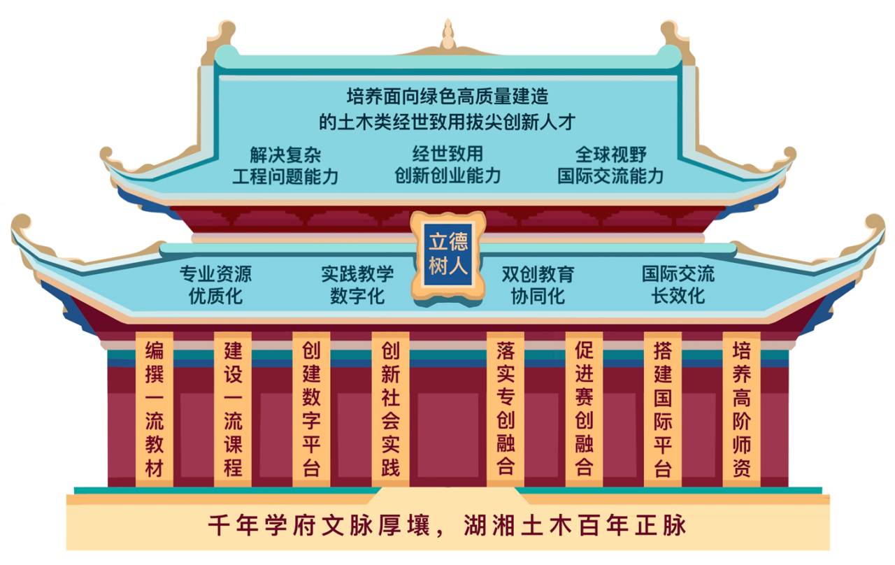 土木类专业源于1903年湖南省垣实业学堂创办的路科。1953年由中南七省高校的土木系和铁道系合并成立中南土木建筑学院。百廿年来,学院始终坚持立德树人根本任务,努力践行“培养未来精英、服务国家社会、勇于发明创新、学问世界水平”的办学理念,为国家和社会培养了包括8名中国工程院院士及6位全国工程勘察设计和监理大师在内的40000多名土木英才。学院提出“一本三能四梁八柱”的人才培养模式,践行20年并在过去5年取得了丰硕的成果。