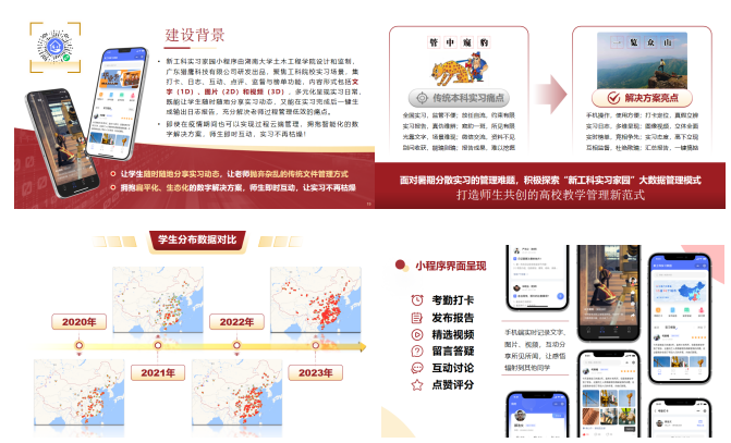 立“数字平台、社会实践”之柱,架“实践教学数字化”之梁。实践教学着力培养学生动手能力和家国情怀,塑造“知行合一、学以致用”品格。创建数字化管理平台和远程实时交互式实践教学平台,打造实践教学生态链,推动现场实习与“云端主播”相结合,有效应对实习基地容量有限、实习终始步调分散、实习地域分布广泛、实习接触面局限等问题。以专业知识为坚实后盾,紧密结合国情社情和专业前沿,创新社会实践举措,助力脱贫攻坚、乡村振兴等国家战略,显著提升“三下乡”社会实践活动成效。