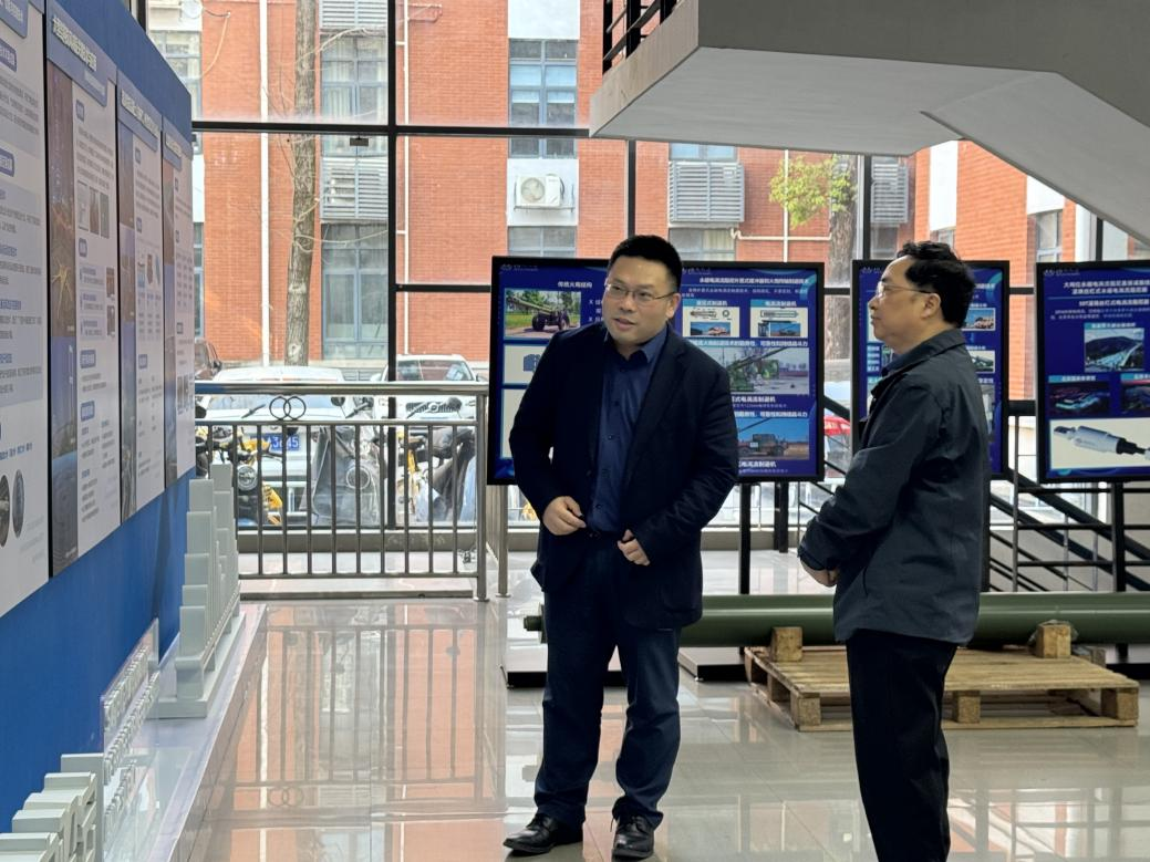 调研组参观了学院全国重点实验室展厅。华旭刚详细介绍了桥梁工程安全与韧性全国重点实验室的核心研究方向与最新科研成果,重点展示了风工程、电涡流阻尼器等领域的突破性进展。
