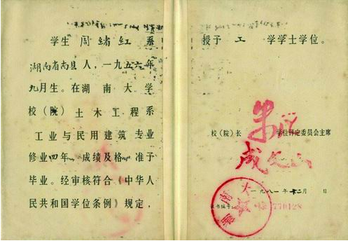 当时,湖南大学土木系教授陈在康的女儿陈滨下乡在农场,我们还一起参加了高考。她父亲来农场时告诉我,湖南大学土木系专业很好,实力很强,全国著名。来农场招生的老师是湖南大学机械系的毛老师,他也说土木系是湖南大学最好的系,说我考得比较好,应该填湖南大学土木系。于是我的高考志愿就选择了湖南大学土木系工业与民用建筑专业,其实当时并不真正清楚这个专业是干什么的。