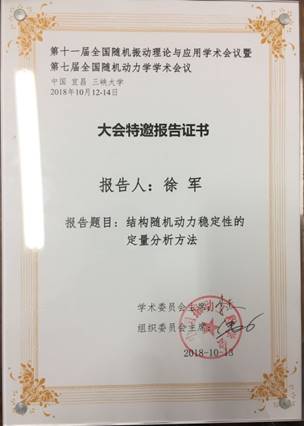 2018年10月12日-14日,第十一届全国随机振动理论与应用学术会议暨第七届全国随机动力学学术会议在湖北宜昌三峡大学举行,土木工程学院徐军副教授在大会做了题为《结构随机动力稳定性的定量分析方法》大会邀请报告,并获得优秀青年学者论文奖。