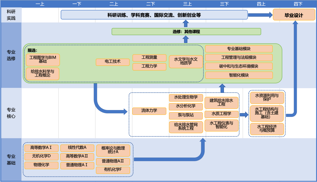 2. 学科知识:具备扎实的数学及自然科学的基础知识,掌握宽厚的给排水工程设计、建造、运维与管理等专业知识,具备适应给排水工程领域人工智能发展和应用的相关基础知识储备。