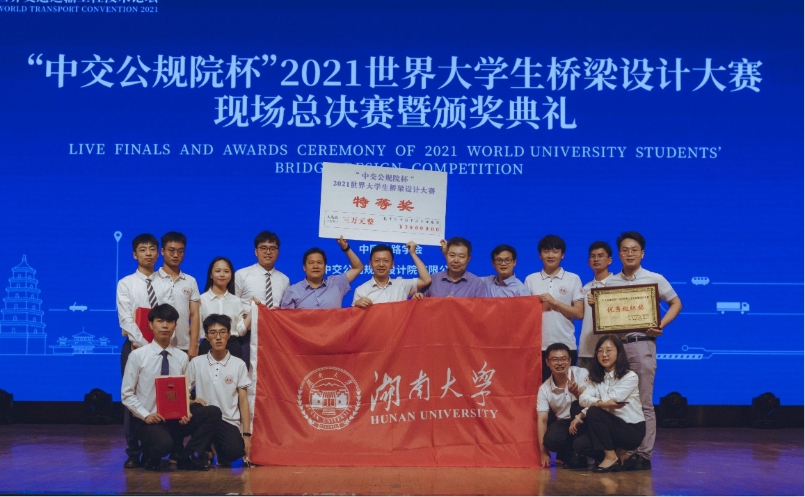 6月18日,“中交公规院杯”2021世界大学生桥梁设计大赛现场总决赛在西安市长安文化艺术中心落下帷幕。我校土木工程学院两支参赛队伍脱颖而出,取得历史性突破!桥梁设计作品《点绛流丹》斩获全国唯一特等奖;作品《静篁桥》荣获全国二等奖;土木工程学院樊伟、刘志文、晏班夫3位教师获评“优秀指导教师”称号;湖南大学获评“优秀组织奖”。