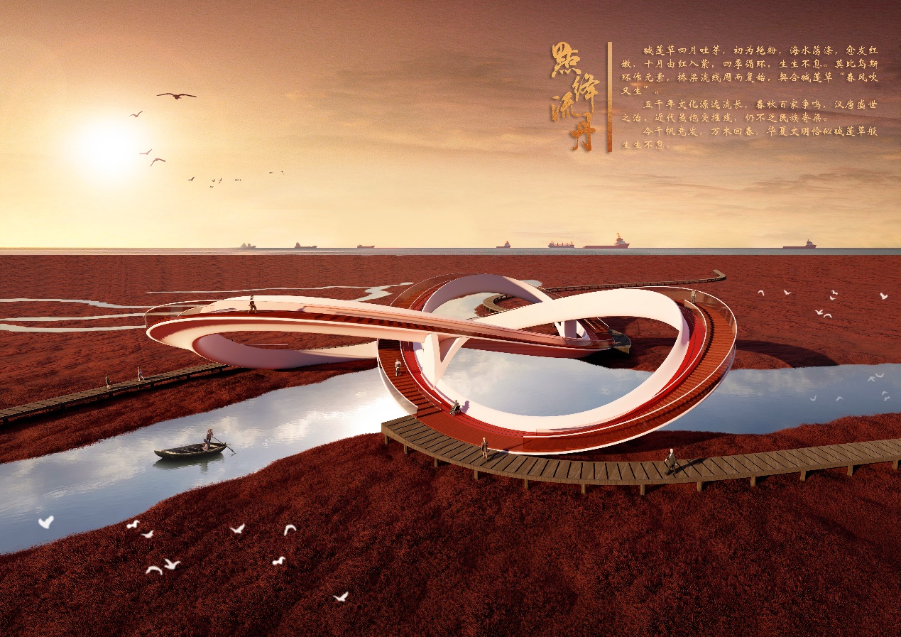 源自:点绛流丹,点绛取自江淹《咏美人春游》:“白雪凝琼貌,明珠点绛唇。”意为红海滩那一株株饱满欲滴的碱蓬草;流丹取自王勃《滕王阁序》:“层峦耸翠,上出重霄;飞阁流丹,下临无地。”意为盘旋舞动的桥梁。桥名结合了一望无际的红海滩碱蓬草景观和流畅的曲线桥型,情景交融,形成一幅生机盎然、雄奇浩瀚的自然画卷。