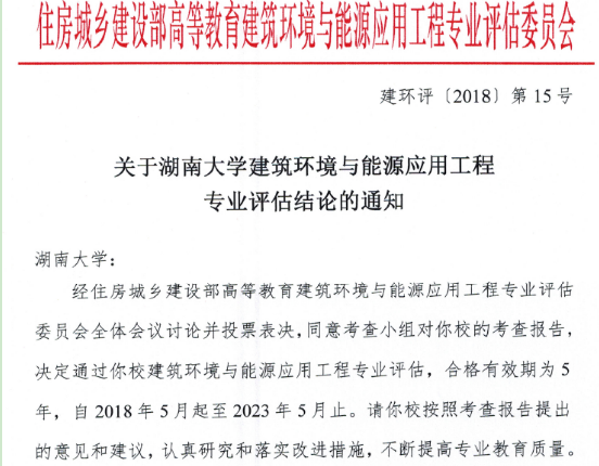 2018年6月8日,住房和城乡建设部高等教育建筑环境与能源应用工程专业评估委员会印发了《关于湖南大学建筑环境与能源应用工程专业评估结论的通知》(建环评(2018)第15号),通过了无码影片