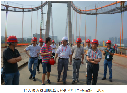 26日下午,260多位代表兴致勃勃地参观了株洲枫溪大桥施工现场,该桥系第一次在悬索桥上采用了由我校邵旭东教授团队研发的钢-STC轻型组合桥面新技术,代表们深入了解轻型组合桥面的性能和实际效果。