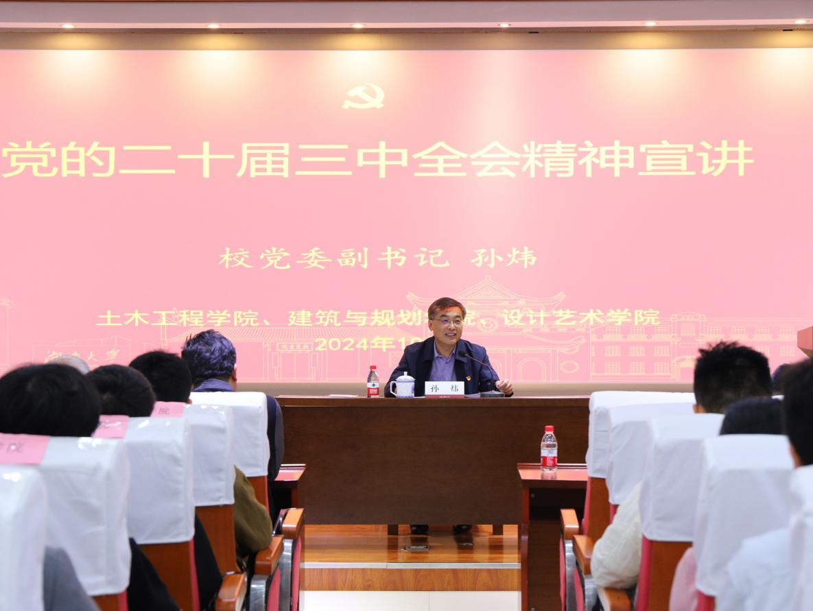 10月17日,学校党委副书记孙炜在土木工程学院A212报告厅作党的二十届三中全会精神宣讲,土木工程学院、建筑与规划学院及设计艺术学院领导班子、师生党员代表、入党积极分子参加此次宣讲会。土木工程学院党委书记刘文主持。