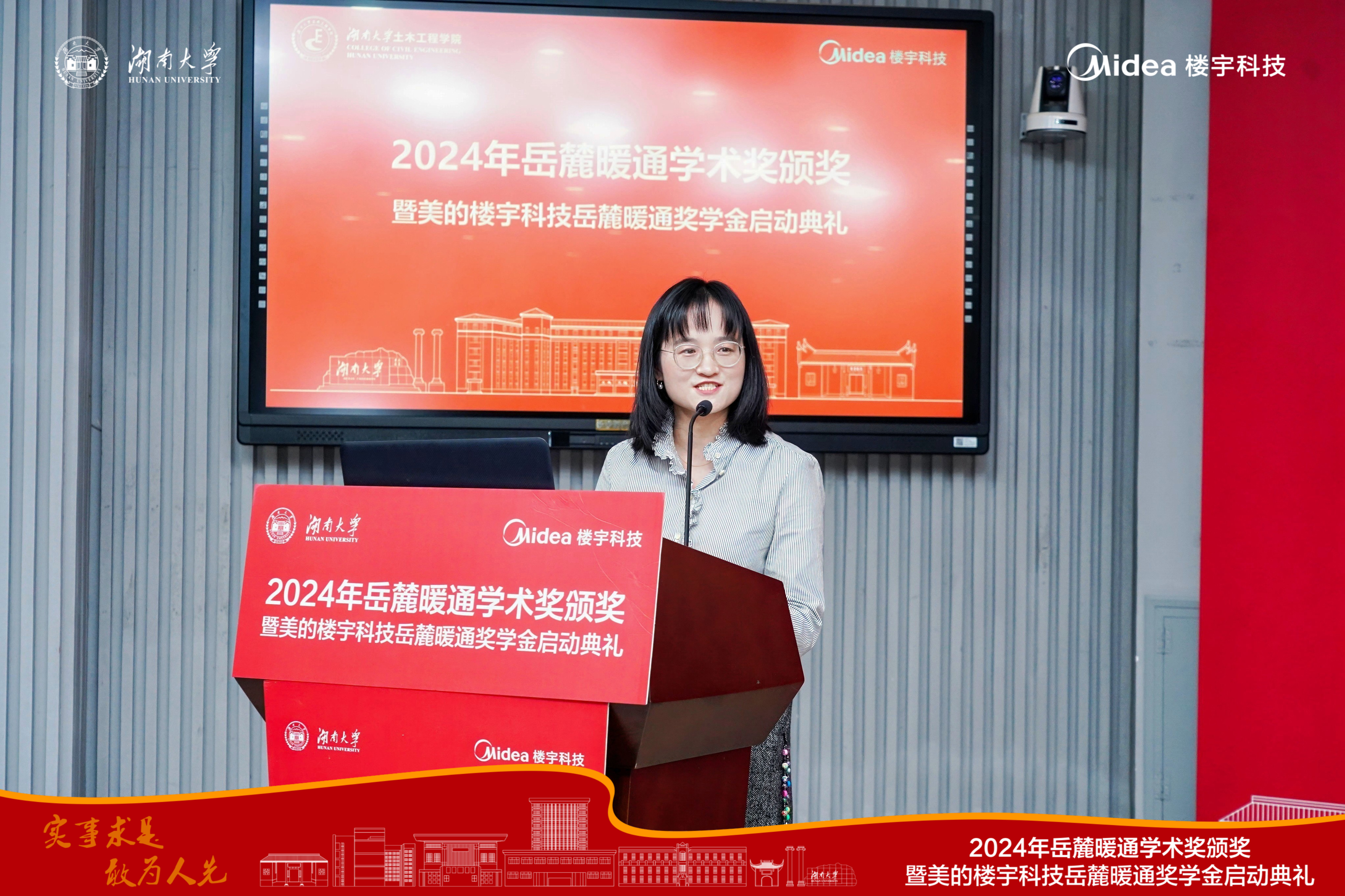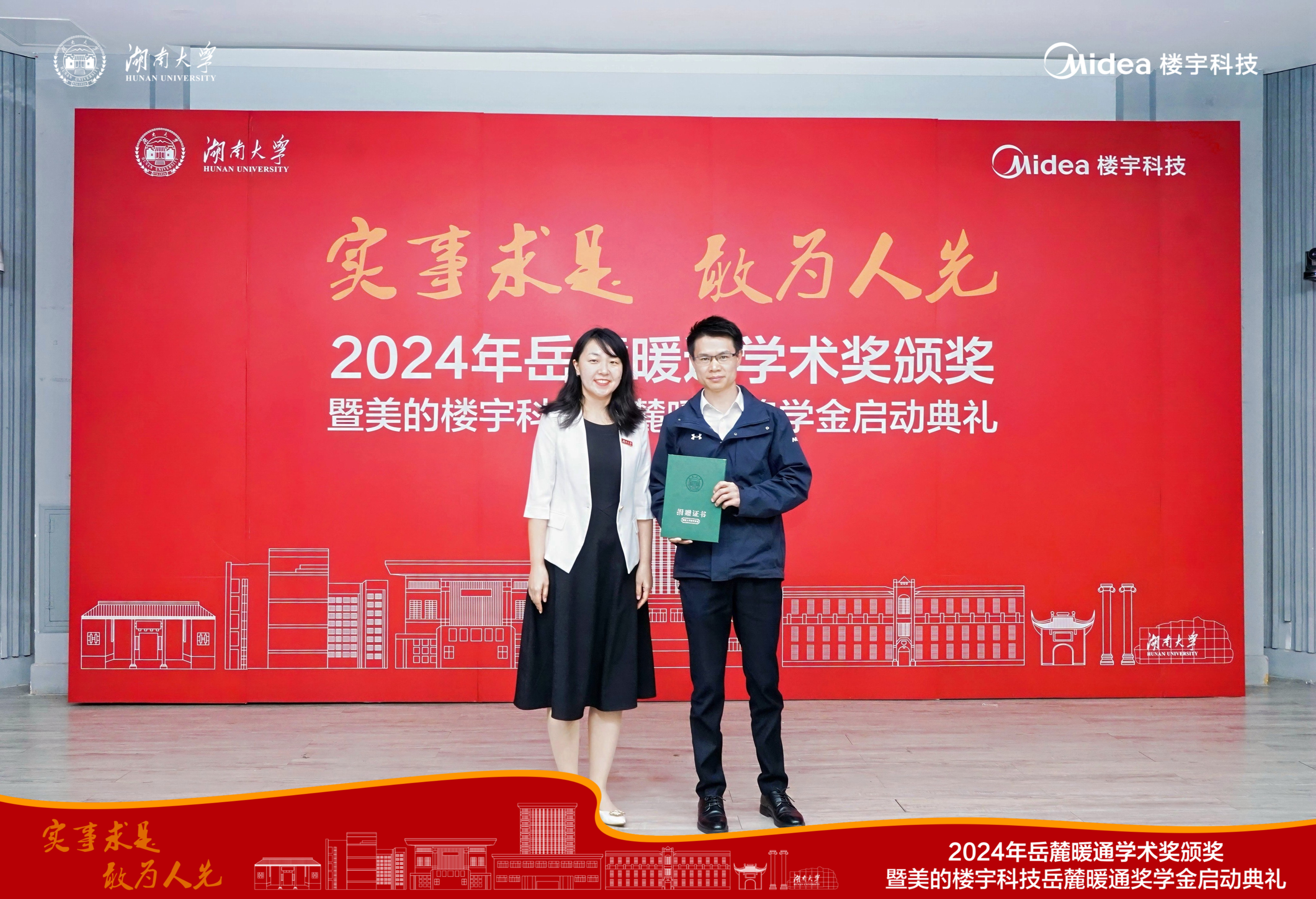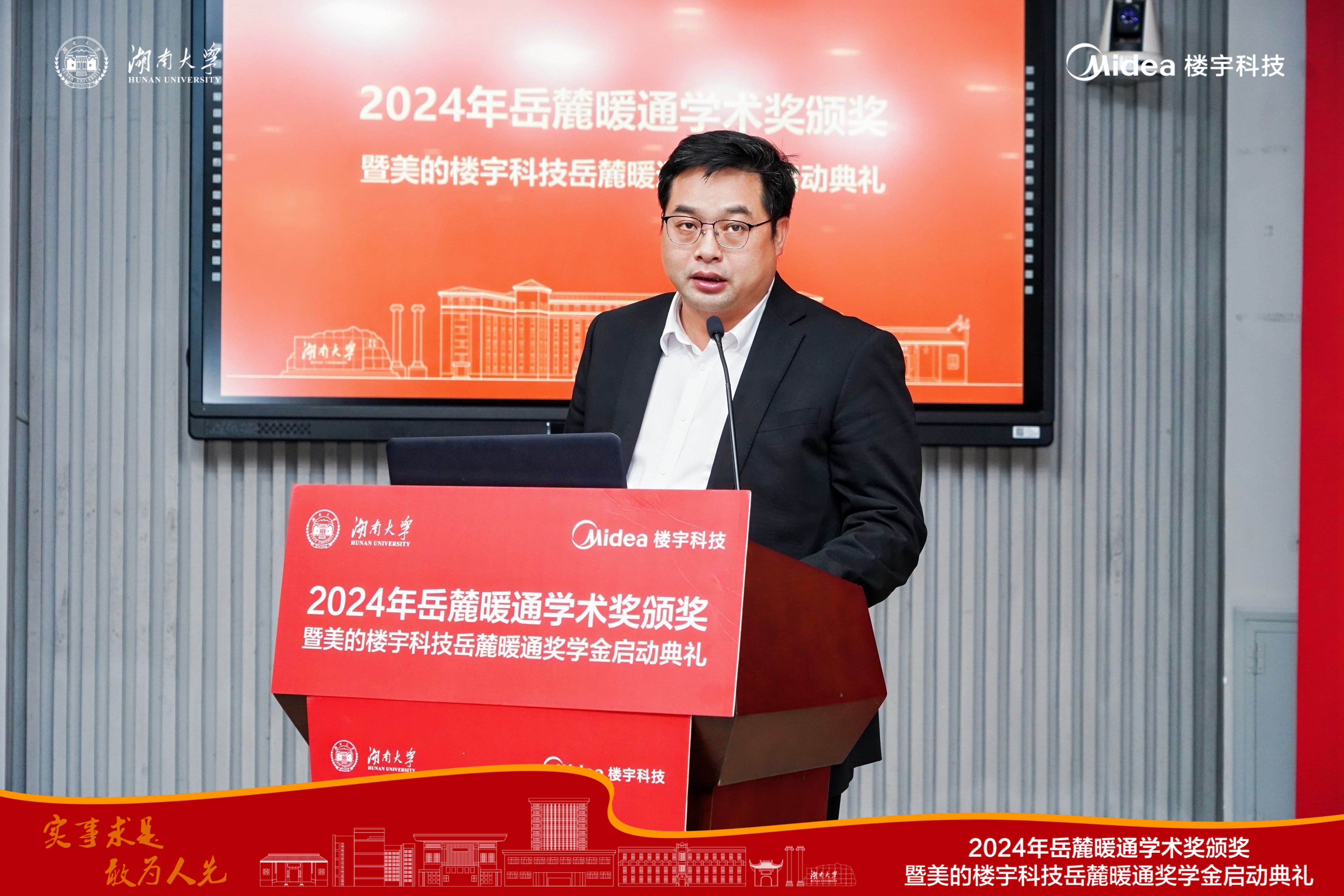 李洪强宣读了2023年度湖南大学岳麓暖通奖学金获奖名单,艾正涛为获奖学生颁发证书。