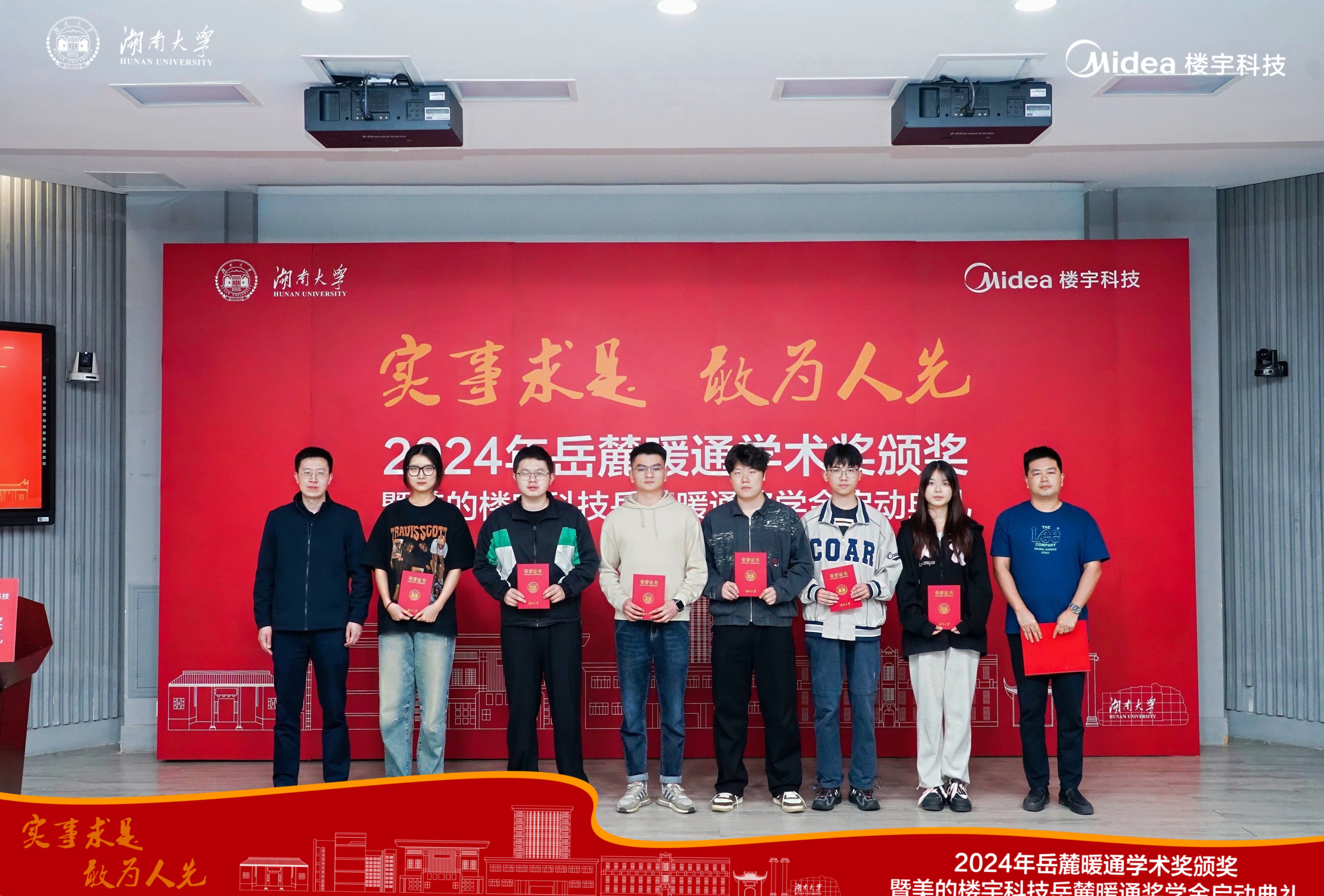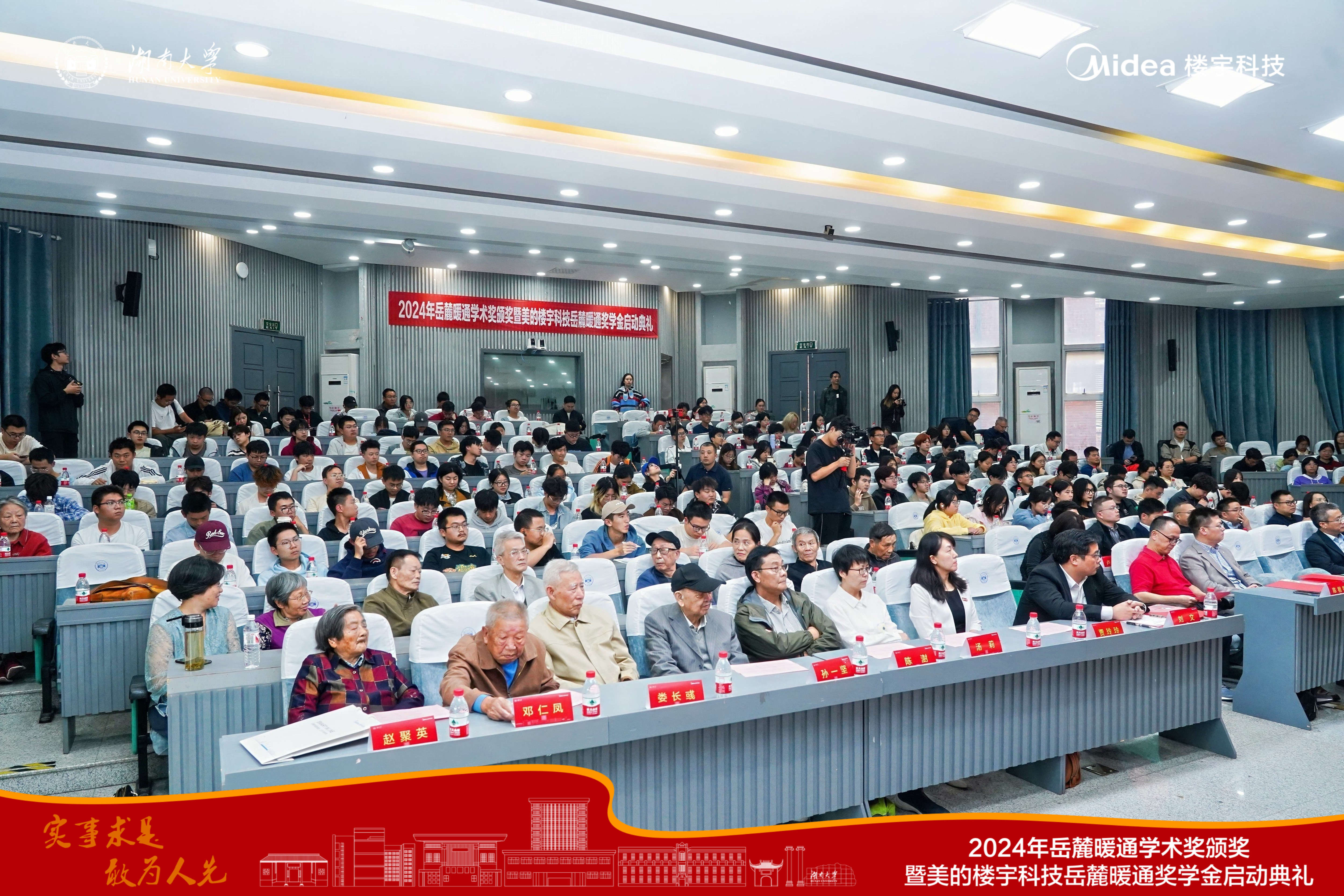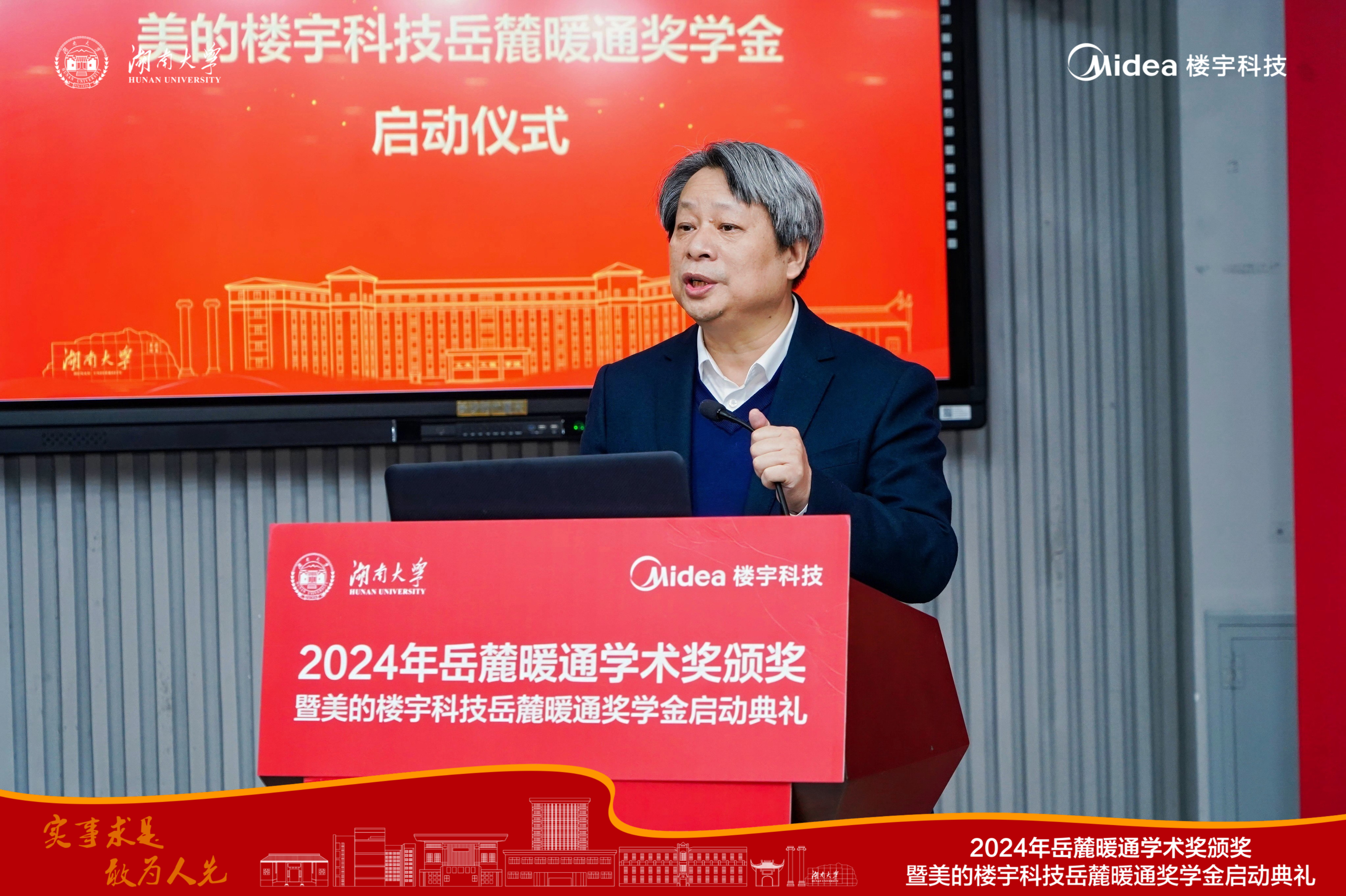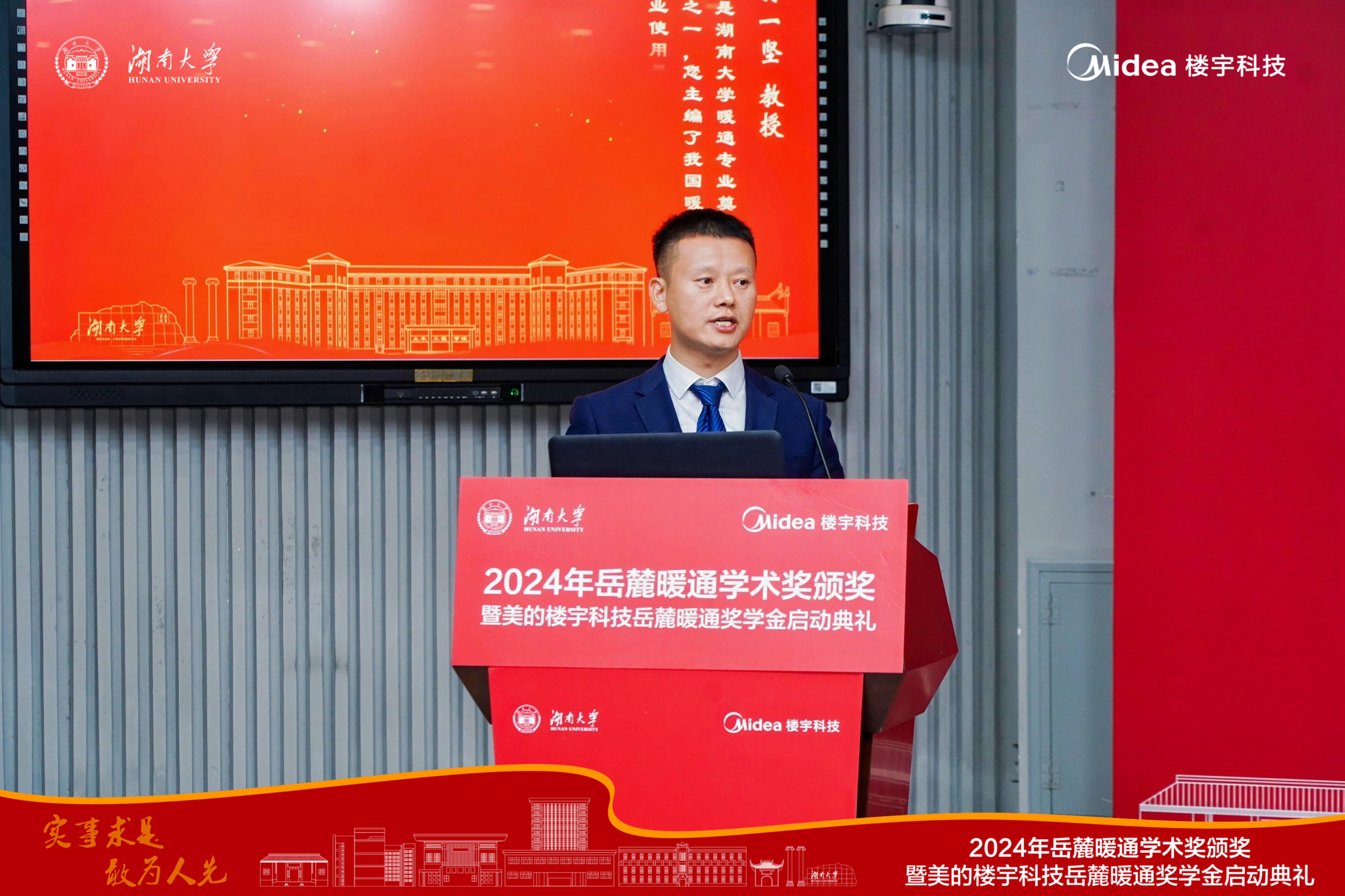 2024年11月8日,美的楼宇科技岳麓暖通奖学金启动典礼在湖南大学复临舍201教室举行。华南理工大学建筑设计研究院副总工程师陈祖铭、中铁第四勘察设计院集团有限公司城地院执行院长赵建伟,美的楼宇科技湖南中心市场推广部经理黄亚波、大型机产品经理沈鹏、大客户经理杨品德、湖大暖通专业十余位前辈及杰出校友、暖通专业师生代表等两百多人应邀出席。学院党委书记刘文、湖南大学校友工作办办公室主任贾玲玲参加典礼,罗伊默主持。
