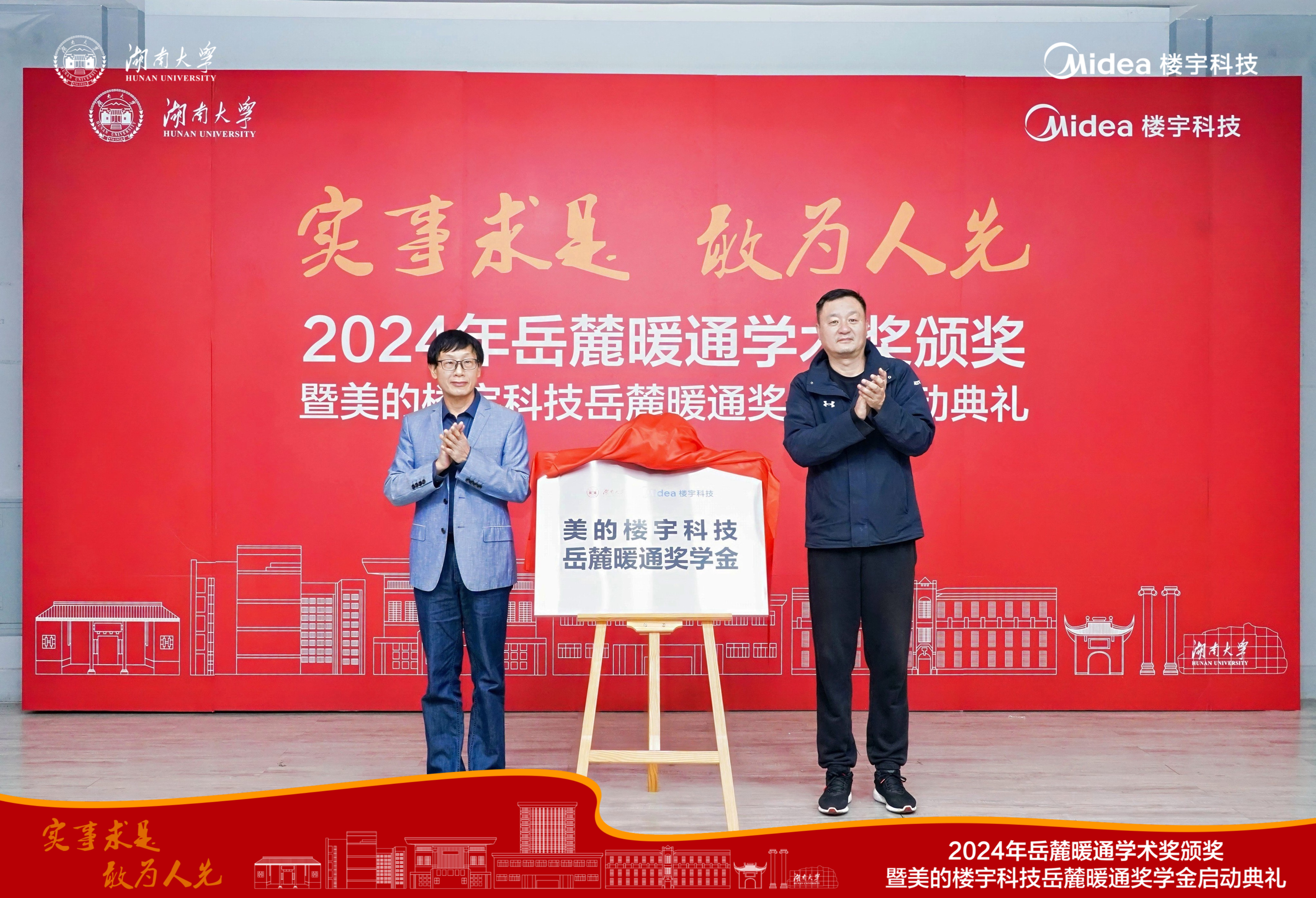 杨昌智和沈鹏共同为“美的楼宇科技岳麓暖通基金”揭幕,贾玲玲为杨品德颁发捐赠证书。