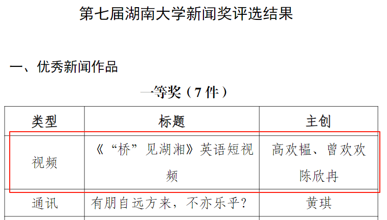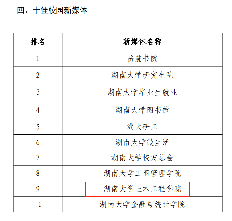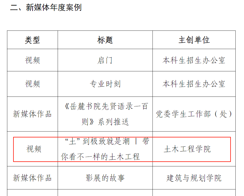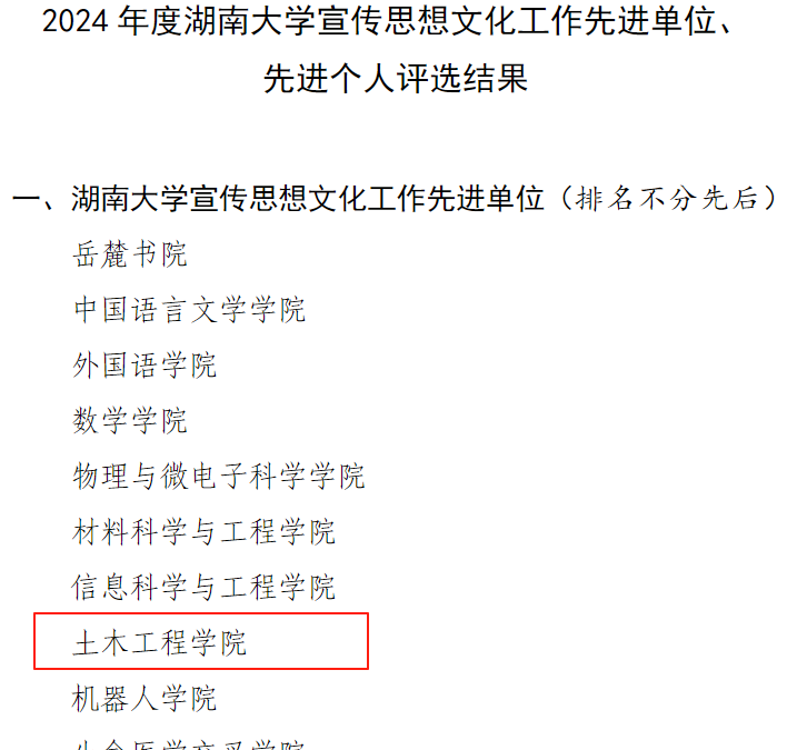 宣传思想文化工作方面,学院被评为“宣传思想文化工作先进单位”,学院新媒体账号“湖南大学土木工程学院”获评十佳校园新媒体,张家辉同志获评“宣传思想文化工作先进个人”,学院原创视频作品《“桥”见湖湘》获得“优秀新闻作品一等奖”,作品《“土”到极致就是潮》荣获“新媒体年度案例奖”,这些作品生动展现了学院在科技创新和文化传承方面的实践成果。