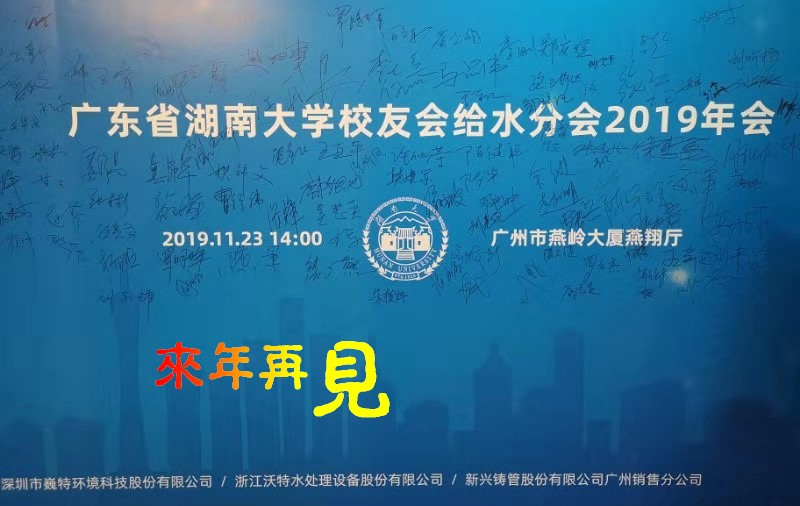 十一月,入冬季,羊城紫荆淌春意。湖南大学给排水专业的校友们在翘首以盼的期待与相互问候声中,迎来了广东省湖南大学给水排水2019年度学术交流会。会议于11月23日下午2:00在广州燕岭大厦举行,共有159名来自广东省内各行各业的校友出席会议,湖南大学给排水专业创始人姜乃昌教授、给排水教研室施周教授、许仕荣教授、余健教授、广东省校友会会长熊燕、副会长兼秘书长徐再良、西安校友会会长燕军、河南校友会法人兼副会长王新正、佛山校友会会长陈华、深圳校友会监事长罗卫东、湖南省省建筑设计院总工程师姚志强、湖南大学深圳研究院院长徐晓波、《给水排水》杂志社社长兼执行主编张彬等校友亲临会场。会议从全体校友们隆重热烈合唱校歌声中开始,在专业前沿的学术报告中展开,到朴实温馨的晚宴结束,师生、校友们共聚一堂,收获前沿知识,忆往昔峥嵘岁月,展未来光辉前景。