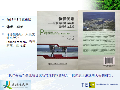 李英博士1992年毕业于湖南大学土木工程系工业与民用建筑专业,1995年在清华大学士木工程系获得硕士学位,2004年在荷兰 Delft University of Technology 获得博士学位。2004年至今一直任荷兰隧道工程咨询公司(Tunnel EngineeringConsultants - TEC )驻中国代表、项目经理。作为TEC中国负责人,李英博士全过程参与港珠澳大桥项目岛隧工程技术咨询的项目管理,深度参与该项目超过10年,运用伙伴关系理念促使和协助TEC和岛隧工程设计与施工总承包单位——中交联合体完成了一次完美的中外伙伴关系合作,成绩得到了港珠澳大桥管理局和中交联合体的高度认可包括书面感谢。期间她翻译出版译著《伙伴关系:厄勒海峡通道项目管理成功之道》,为港珠澳大桥和业界的同行们提供了国际项目管理的成功经验。