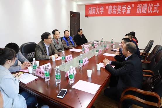 2018年10月23日上午,湖南大学“廖宏奖学金”捐赠仪式在土木院A206会议室举行,我院93级校友、湖南省宏尚检测技术股份有限公司董事长廖宏先生,湖南省宏尚检测技术股份有限公司副总经理曾斌先生,公司研发部长石立君先生,公司经营部部长昌萍女士,员工代表王健女士,土木工程学院党委书记施周教授,学院史才军教授、方志教授,湖南大学教育基金会蔡胜老师、刘垠杉老师,学院学生办主任向杰老师等出席会议。捐赠仪式由学院党委副书记颜李主持。
