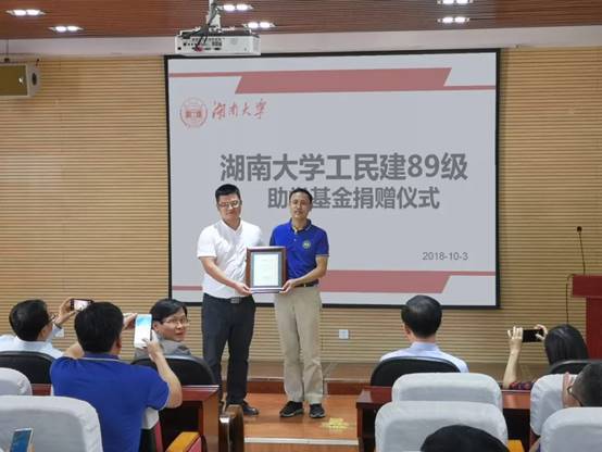10月3日,湖南大学土木系工民建专业89级校友助学基金(简称“湖大工民建89级助学基金”)成立,土木院成为拥有“肖春源奖助学金”、“皓芬奖学金”、“82级给排水助学金”、“92级给排水助学金”、“土木83级奖助学金”、“公路78级奖学金”、“80级公路助学金”、“公路90级基金”、“交通土建92级共识奖学金”、“98级建工专业奖助学金”、"98级给水专业奖学金”“碧水源奖助学金”“廖宏奖学金””湖大工民建89级助学基金”、“湖大暖通基金”等校友返校设立的奖助金最多学院之一。